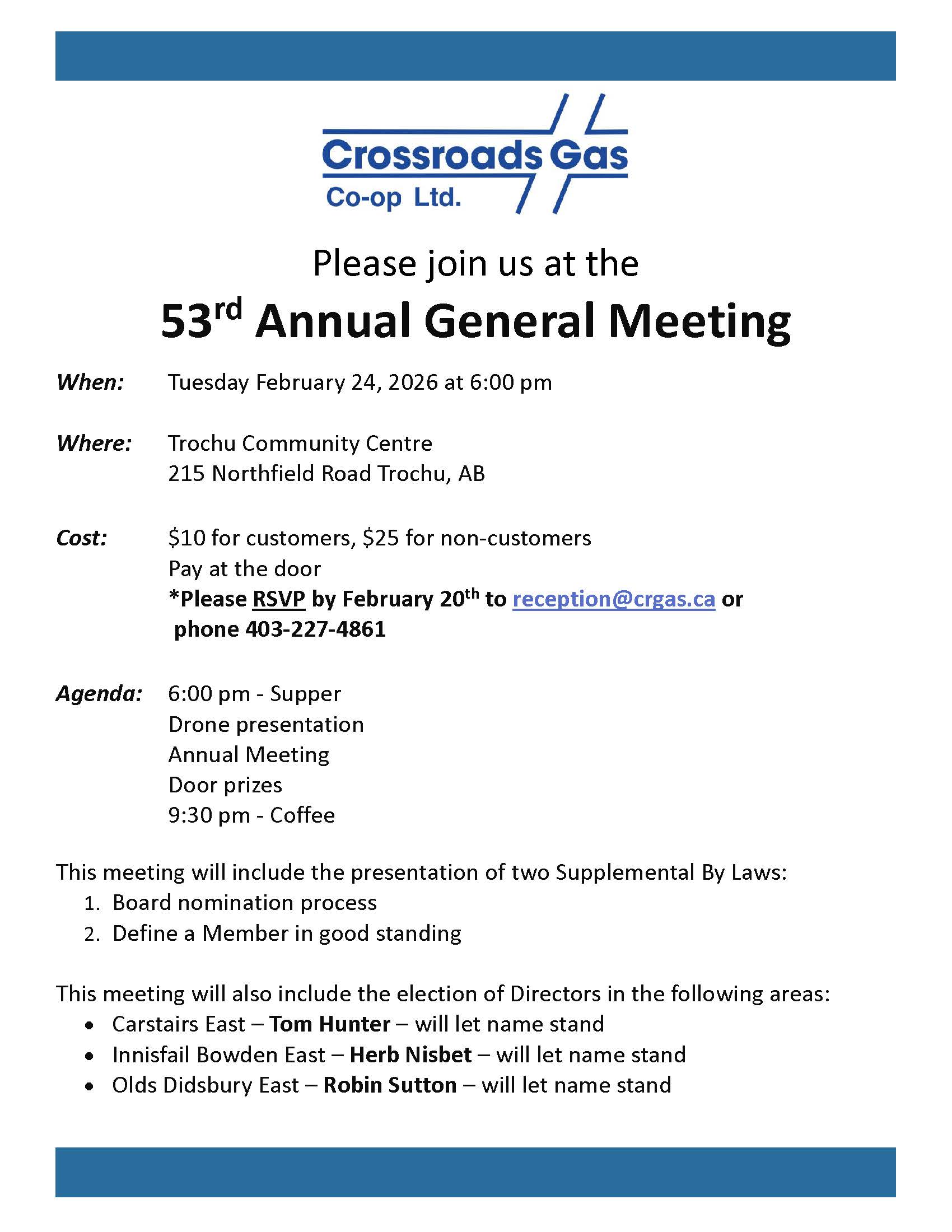 Please keep yourself and your community safe by calling or Clicking Before You Dig. Before you disturb the ground, visit UtilitySafety.ca or call 1-800-242-3447 to get all your underground utilities located. Crossroads Gas responds to locates quickly so we don’t hold up your project.